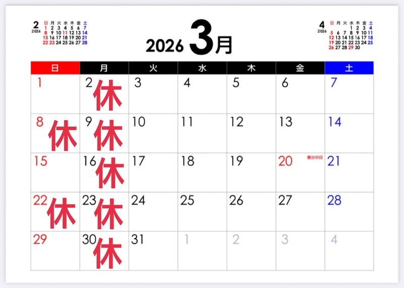 毎週月曜日と第2、第4日曜日は定休日です。